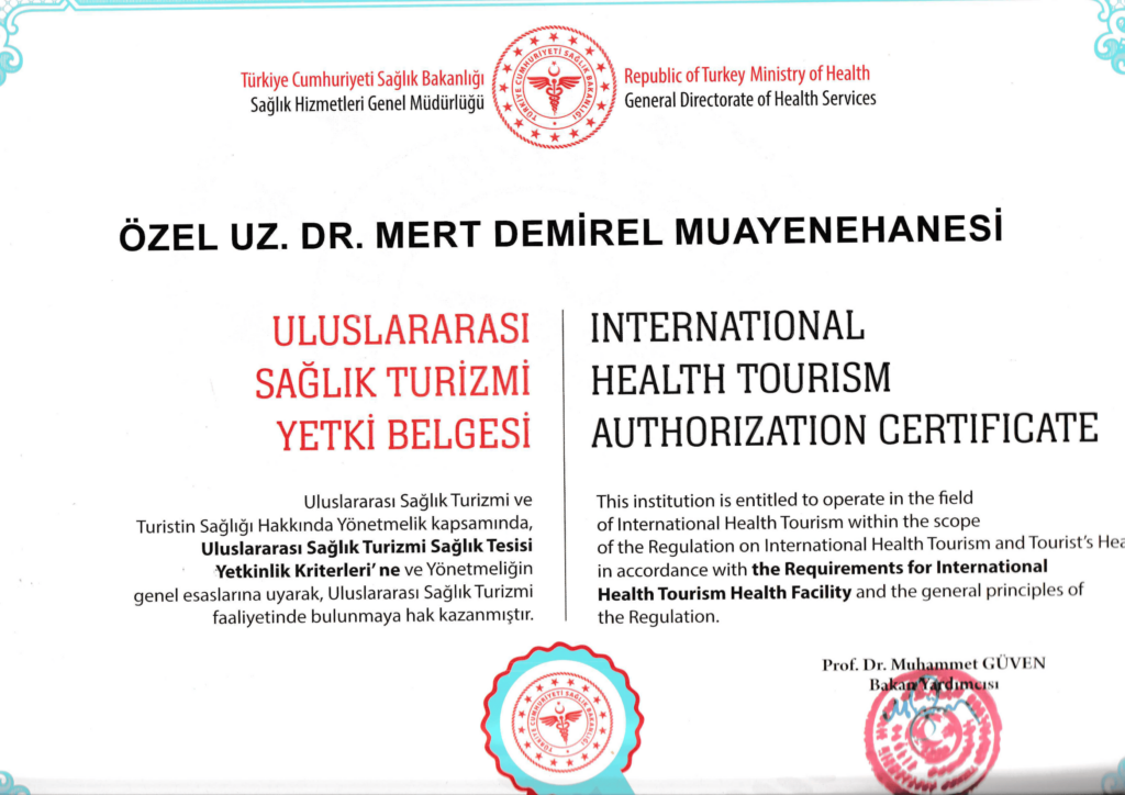 Dr. Mert Demirel’s clinic holds the International Health Tourism Authorization Certificate issued by the Republic of Turkey Ministry of Health – General Directorate of Health Services. This official authorization confirms that the clinic meets the regulatory requirements established by the Turkish government for providing medical services to international patients within the framework of health tourism.